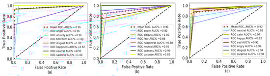 (a) ROC curve of the system for EMO-DB. (b) ROC curve of the system for SAVEE. (c) ROC curve of the system for RAVDESS.