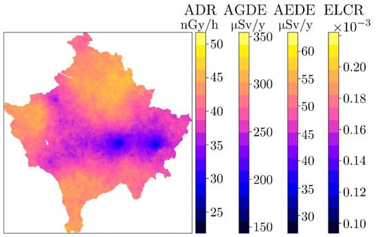 - Yeşilkanat, C.M.; Kobya, Y.; Taşkin, H.; Çevik, U. Dose rate estimates and spatial interpolation maps of outdoor gamma dose rate with geostatistical methods; A case study from Artvin, Turkey. J. Environ. Radioact. 2015, 150, 132–144. [Google Scholar] [CrossRef] [PubMed]