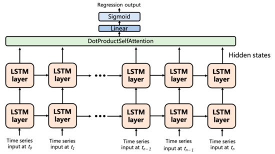 Figure 5, a multi-layer LSTM model structure is constructed to extract the multiple hidden states of the output with respect to the input deformation sequence data. A dot product self-attention module is applied to consider all the outputs of the hidden states from the last LSTM layers. The outputs of the attention module are then processed through the linear layer and sigmoid activation function to obtain the final regression output prediction with the same sequence length as the input.