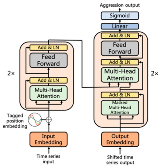 The decoder layer has a similar structure to the encoder layer, which has an output dimension of one. Using the same approach as shown in the attention-enhanced LSTM, the outputs of the decoder layer are then processed through the linear layer and sigmoid activation function. The output prediction should have the same sequence length as the input.