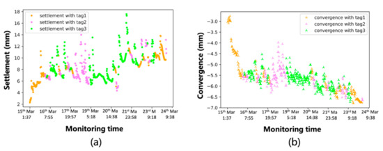 Section 1, the tilt and distance of the two sensors pointing towards the tunnel crown can be obtained. The settlement over the three weeks can be obtained using the data filtering method introduced, as shown in