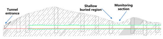 This study implemented the monitoring systems in this shallow buried region to mitigate the construction risks. It should be noted that this section was excavated by the CD method, and the upper pilot hole was excavated strictly by non-blasting excavation. The tunnel was constructed from the shallowly buried region using the drill and blasting method.