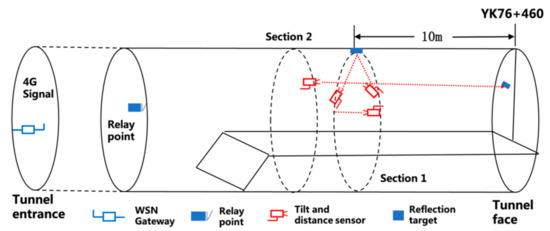 Figure 9. To monitor the tunnel deformation during construction in a shallow buried region, four WTDS nodes were deployed, three of which monitored the deformation of a transverse section near the tunnel face, and one sensor monitored the face deformation. The sensor locations in the transverse section were based on the arrangement in
