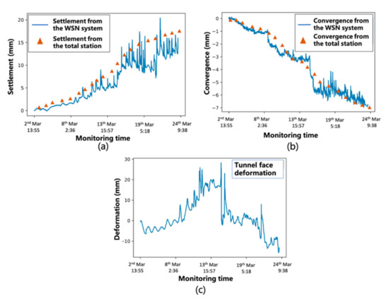 Figure 10, the filtered monitoring data of crown settlement and horizontal convergence agree well with the total station measurements. They can reflect the dynamic changing of deformations during tunnel construction. Nevertheless, there is no measured data on the tunnel face deformation from the total station, and it is hard to discover the correlation between the measured deformations between the selected transverse section (