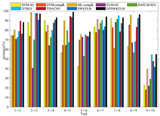 In the comparative experiment, the comparison of the recognition effect of the DTSWKELM algorithm with other algorithms on this dataset is shown to verify the effectiveness of the DTSWKELM algorithm. Two different sets of comparative experiments are set up: the first set of experiments uses Batch1 data as the source domain data, and Batch2–9 data as the target domain data. The second set of experiments uses adjacent batch data as two datasets, that is, using Batch N−1 data as the source domain data and Batch N data as the target domain data. At the same time, seven commonly used sensor drift compensation algorithms were selected for the comparison of recognition effects, namely SVM-rbf algorithm, SVM-comgfk algorithm, ML-comgfk algorithm, ELM-rbf algorithm, DAELM-S (5) algorithm, domain transfer broad learning system, SWKELM algorithm, DTBLS algorithm, and TDACNN algorithm [,].