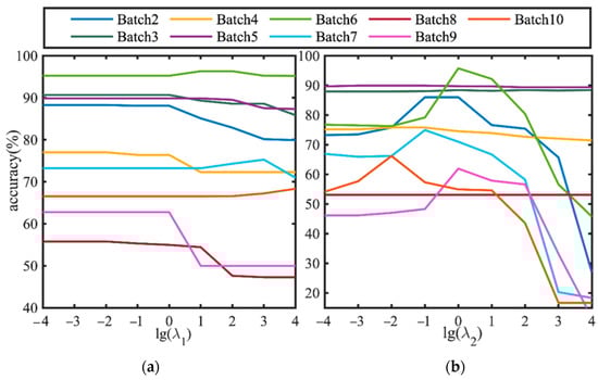 The impact of the trade-off parameters and on the algorithm recognition effect. (a) The influence of on the algorithm; (b) the influence of on the algorithm.