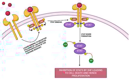 In MCF7 cells, 2HF intensified the inhibitory action of imatinib mesylate/gleevec and depleted the estrogen receptor (ERα). 2HF inhibits the TGF-β1 canonical pathway and switches on tumor suppressor 53 (TP53) in MCF7 and MDA-MB-231 cells. The level of the mercapturic acid pathway transporter 76kDaral-interacting protein (RLIP76) is elevated in BC as it is important in cancer cell growth and metastasis. It is a multifunctional protein as it is a transporter of glutathione electrophile conjugates (GS-Es), and takes part in mitotic spindle formation by binding to Ral, in response to stress it shifts between, the nucleus, cytosol, and membranes it is present throughout the cell. 2HF not only increases RLIP76 exhaustion in BC cells but also restricts the transport of doxorubicin in BC cells [21]. The efflux of doxorubicin is inhibited by 2HF, elevating its levels in the cell [13]. In vitro studies with MDA-MB-231 BC cells demonstrated a reduction in RLIP76 by 2HF. The cells lose their ability to move when 2HF inhibits angiogenesis in vivo and in vitro due to the depletion of CD31 and vascular endothelial growth factor (VEGF), respectively [16]. The expression of the receptor tyrosine-protein kinase erbB-2 (HER2) gene is downregulated by 2HF in SKBR3 cells [21]. 2HF also prohibits the switch on of the STAT3 pathway causing inhibition of cell proliferation [22] (Figure 2). Numerous biological processes are dependent on STAT3, a multipurpose transcription factor. Janus kinases (JAKs) activate STATs in the cytoplasm via transduction of cytokine-mediated signals. When the ligand binds to the receptor, JAK auto-phosphorylates, which further leads to the phosphorylation of STAT and its activation, forming a homodimer. It further moves into the nucleus and helps in the signal interchange between the nucleus and the cytoplasm. In this way, STAT3 helps in many biological processes such as cell proliferation, survival, and maturation of cells [23,24]. In the normal cells, the activation of STAT3 is strictly regulated, but when the activation continues beyond the required need it leads to tumorigenesis and involves migration, cell proliferation, invasion, and angiogenesis [25]. Thus, STAT3 is contemplated as oncogenes [23]. In breast cancer, Oncostatin M (OSM) causes the phosphorylation of STAT3 and an increase in interleukin-6 (IL-6), leading to its progression [24].