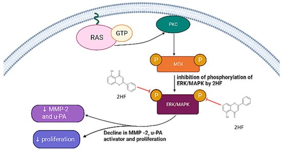 2HF prohibits the phosphorylation of p38 mitogen-activated protein kinase (MAPK) and extracellular signal-regulated kinase 1/2 (ERK1/2). The inactivation of the p38MAPK and ERK1/2 pathways due to 2HF led to a decline in the expression of matrix metalloproteinase (MMP-2) and urokinase-type plasminogen activator (u-PA) (Figure 3). A culture treated with SB203580 p38 (MAPK inhibitor) and U0126 (ERK 1/2 inhibitor) showed a decrease in the expression of MMP-2 and uPA along with inhibition of cell invasion. 2HF also weakens the activation of AP-1 and NF-kappa B. Oral administration of 2HF in vivo restricts the metastasis of A549 cells and Lewis lung carcinoma (LLC). Therefore, 2HF restricts the motility, invasion, and cell-matrix adhesion of A-549 cells [29]. Multiple cellular processes such as apoptosis, differentiation, proliferation, and stress response are mediated by MAPK cascades of signaling pathways. The prolonged activation of ERK is responsible for cancer and its progression, whereas a regulated expression is important for development. The pathway plays a critical role in the development and existence of tumor cells [30]. When the growth factors bind to the receptors on the cell surface, there is upregulation in Ras-guanosine triphosphate (GTP), which leads to the activation of the kinase. The GTP-bound Ras binds and leads to Raf kinase attachment to the plasma membrane. Further, it auto-phosphorylates or is phosphorylated by other kinases. Then there is sequential phosphorylation and activation of MEK followed by ERK1/2 [31]. The aberrant activation of the MAPK pathway leads to tumor formation.
