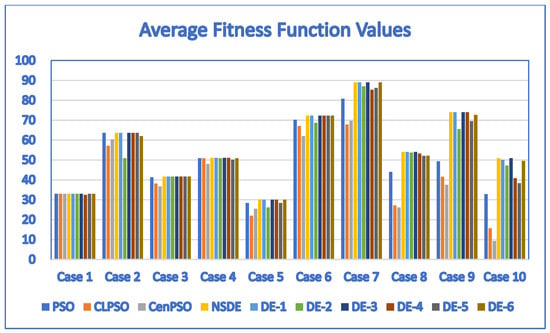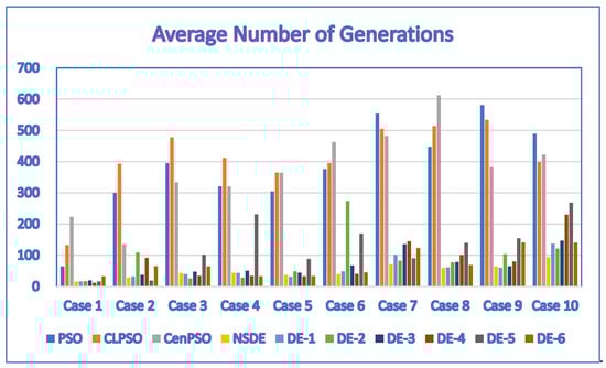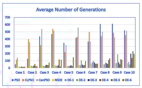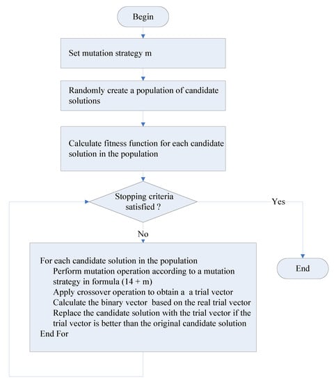 Please refer to Table 2 for the notations and variables used in the seven DE-based algorithms. The seven DE-based algorithms considered in this study all followed the same three-step operation process: mutation, crossover, and selection. Figure 1 shows the flow chart for the seven DE-based algorithms. The differences between the seven variants of the DE algorithm were the mutation strategies used. In this paper, we refer to the seven mutation strategies used by the seven DE-based algorithms as m . For convenience, we use DE-m to refer to the variant of the DE algorithm that used mutation strategy m, m . We also refer to DE-7 as NSDE, as it was based on neighborhood search.