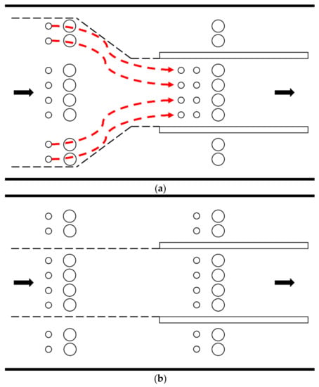 Particles gain an inertial force as they move along the flow direction, and the degree of isokinetic sampling is determined according to free-stream and sampling flow velocity [10]. Figure 1a shows the super-isokinetic sampling of particles when the velocity inside the sampler is faster than that of the free stream, which results in greater inertia of the particles. By contrast, Figure 1c shows the case of sub-isokinetic sampling of particles along the flow arising from the slower velocity of the particles inside the sampler compared with the particles in the free stream. As shown in Figure 1b, an accurate particle concentration can be obtained only from isokinetic sampling [11]. Therefore, typical sampling of an aerosol can be performed, and pollutants can be effectively controlled by developing an isokinetic sampler [12].