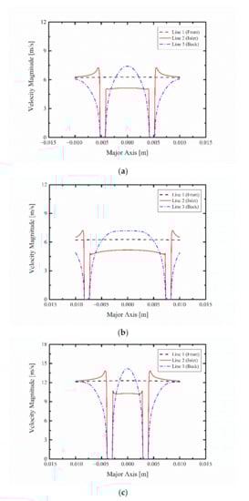 Figure 8 shows the velocity distribution obtained by dividing the sampling probe inlet into front (Line 1), inlet (Line 2), and rear (Line 3) sections, as shown in Figure 3, and setting the length of the lines to 2 cm in the major-axis direction. Figure 8a,b show the velocity distribution when the free-stream velocity is 5 m/s; it can be seen that the velocity represented by Line 1 is constant regardless of the sampling probe type, while that of Line 2 increases toward the sampling probe wall and then decreases to 0 at the inlet tip marked in Figure 3, similarly to the velocity of the flow field around the sampling probe inlet where flow suction actually occurs. Then, the velocity represented by Line 3 decreases to 0 on the sampling probe wall owing to the viscosity effect, and a velocity boundary layer is developed with a smooth curve. For the circular inlet with an identical radius, the difference between the maximum and minimum flow velocities is 0.56 m/s in the −0.0042–0.0042 m range in which actual suction in the sampling probe occurs, as represented by Line 2. For the ellipsoidal inlet, the difference between the maximum and minimum flow velocities is 0.61 m/s in the −0.00735–0.00735 m range. Hence, the difference between the two inlets is 0.05 m/s, which is negligible because it accounts for only 1.05% of the 5 m/s free-stream velocity. Figure 8c,d show the flow velocity distribution around the sampling probe at 10 m/s. In Line 2, the flow velocity decreases further at the inlet tip of the sampling probe compared with that of the 5 m/s condition. Figure 8e,f display the flow velocity distribution around the sampling probe at 15 m/s; similarly, the flow velocity again decreases at the inlet tip of the sampling probe, which becomes more noticeable as the free-stream velocity increases. In addition, as the flow velocities of Line 1 and Line 2 are similar, it can be concluded that the sampling probe suctions the free-stream velocity without distortion; compared with the circular inlet, the ellipsoidal inlet gives rise to a 0.92% more similar flow velocity as the free stream, which is a trivial difference.