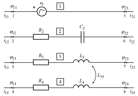 Figure 3 shows the entire coupled linear circuit as a unique finite element (FE) prepared for the FET procedure. It has eight local nodes and four branches. The first branch contains an electromotive force that is a ramp function (in the time interval 0–100 ms increases its value from 0 up to 10 V). The value of the time interval Δt was taken as 0.1 ms. The values of the circuit elements were assumed to be as follows: R2 = 1 Ω, R3 = 2 Ω, R4 = 1 Ω, C2 = 1 mF, L3 = 0.1 H, L4 = 0.01 H, L34 = 0.1 mH.