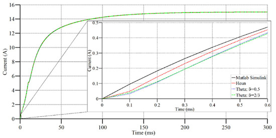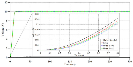 Figure 4 shows the current in the first branch during the 0–0.6 ms time interval as well as during the entire simulation while Figure 5 shows the second branch capacitor voltage during the 0–0.8 ms time interval, as well as during the entire simulation. Numerical solutions obtained using Heun’s method and using the generalized trapezoidal rule were compared to the solution obtained by Matlab Simulink software.
