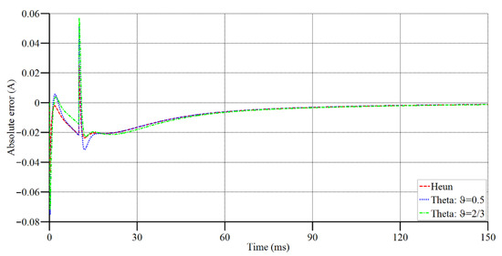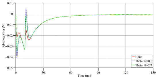 In ref. [27], which is based on the classical FEM procedure, an algebraic local system of equations for a MTL transient analysis was obtained using the generalized trapezoidal rule (ϑ-method) for the time integration scheme. In ref. [28], an algorithm was developed for electromagnetic transient calculations on the MTL achieved by improvement of the time integration when forming the local system of equations for the finite element. Improvement of accuracy was obtained by using Heun’s method. It was shown that in the case of Heun’s method and the ϑ-method time integration scheme, higher accuracy was obtained by using Heun’s method. Heun’s method [29] is one of the variants of the Runge–Kutta second-order time integration method. The problem when using the ϑ-method is the fact that the accuracy of results highly depends on the chosen time integration parameter value. The developed algorithm allows us to choose various types of time integration schemes when forming the local system of equations for a coupled circuit finite element. In this paper, the local system of equations of a coupled circuit finite element was obtained using the generalized trapezoidal rule (ϑ-method) as well as using Heun’s method.