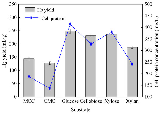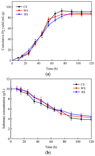 Lignocellulosic biomass is considered an attractive material for hydrogen production, owing to its abundance and renewability on earth. Unfortunately, hydrogen-fermentative microbes cannot utilize lignocellulose effectively because of its highly polymeric structure and hard biodegradability [6,7]. Hence, several pretreatment methods are performed to break down the lignocellulosic biomass into soluble sugar, which is easily utilized by hydrogen-fermentative bacteria. Pretreatment processes can be classified as chemical, physical and biological, etc. [8,9,10,11]. During pretreatment processes, there are disadvantages that should not be ignored, such as equipment corrosion, high energy consumption, the generation of microbial growth inhibitors, the time-consuming nature of the process, etc. Undoubtedly, these processes will lead to higher costs and block the commercialization of hydrogen production from cellulose-based biomass.