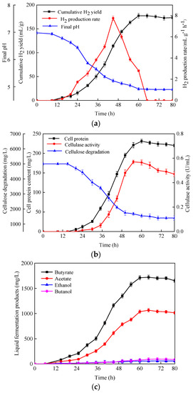 Based on the results of hydrogen production from various carbohydrates, the dynamics of hydrogen fermentation by C. populeti FZ10 with 10 g/L MCC were further investigated. As presented in Figure 4a, a lag time of 15 h was observed. When the fermentation time was between 20 and 45 h, the cumulative hydrogen yield (Ps) and hydrogen production rate (Rm) increased rapidly. Thereafter, Ps remained essentially constant, while Rm decreased sharply. The maximum Ps and Rm were 177.5 ± 4.8 mL/g and 7.7 ± 0.2 mL·g−1·h−1, respectively. As fermentation progressed, the medium pH changed significantly. The pH value dropped from an initial 6.98 to 5.12 during the first 50 h. Subsequently, alongside hydrogen production and the formation of acidic metabolites, the pH value gradually stabilized at about 4.91. These results were similar to previous reports, in which cellulose degradation and hydrogen production did not occur when the medium pH was lower than 5.5 [35].