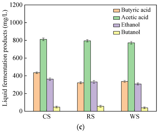 H2 fermentation from lignocellulosic biomasses by C. populeti FZ10. (a) Cumulative H2 yield, (b) substrate concentration, (c) liquid fermentation products.