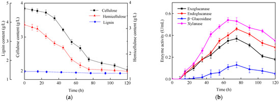 In addition to the observation of surface morphology, the changes in the chemical components of CS and the enzyme activity of the fermentation broth were also analyzed. As presented in Figure 7a, the hemicellulose content decreased significantly after cultivation for 25 h, while the cellulose content did not drop until cultivation for 35 h. The reason might be that hemicellulose, with its lower polymerization degree, is more easily degraded than cellulose by C. populeti FZ10. We noticed that the lignin content had no obvious change, indicating that C. populeti FZ10 could not degrade lignin efficiently. At the end of fermentation, 47.2 ± 2.3% of cellulose and 58.1 ± 2.0% of hemicelluloses in corn stalk were degraded by C. populeti FZ10. Consistent with the degradation of cellulose and hemicellulose, the activity of exoglucanase, endoglucanase and xylanase increased rapidly after cultivation for 25 h, reaching the maximum values of 0.37 ± 0.02 U/mL, 0.46 ± 0.01 U/mL and 0.54 ± 0.02 U/mL, respectively (Figure 7b). β-glucosidase activity was not obviously detected until cultivation for 45 h, achieving a maximum activity of 0.13 ± 0.02 U/mL. These results further indicated the degradation of cellulose and hemicellulose in untreated corn stalk by C. populeti FZ10.