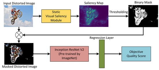 Figure 2 shows the proposed framework for the prediction of the quality of the image. The proposed architecture includes a visual saliency module that extracts the important region of the image and allows the neural network model to pay attention to the important region only. This allows removing the maximum outliers from the learned feature space. The distorted images are affected by noise, and the noise mainly affects the high-frequency regions. The high-frequency regions are extracted well by the static visual saliency module. The visual saliency map is thresholded to find the binary mask, which is multiplied by the input distorted image in order to obtain the masked distorted image, as illustrated in Figure 2. The extracted masked and distorted image is passed by Inception-ResNet-V2 in order to predict the quality of the image.