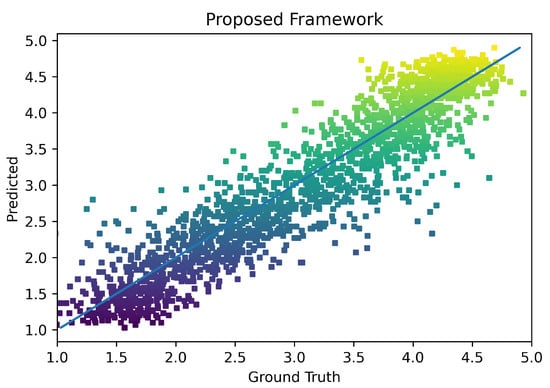 Figure 3 shows a scatter plot between the predicted quality score and the actual quality score. As can be seen, there are minimal outliers in the scatter plot. The scatter plot was very near to the ideal inclined line. This demonstrates that the visual saliency was able to find the important regions, and predicting based on those regions made the prediction more accurate, as unwanted regions leading to wrong predictions were ignored. It is important to highlight here the limitation of the proposed framework. The proposed framework intends to fail in the situation where there is no object (having no high-frequency component) in the image, as the visual saliency model will not extract the important region.