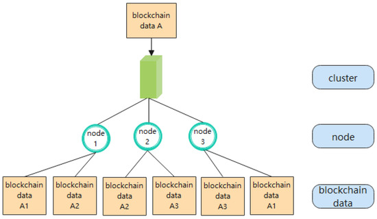 Block data is divided and stored in the cluster based on parameters such as the number of nodes in the cluster and the total data volume of the block. The nodes in the cluster store the block data in an overlapping manner, and the storage capacity available in a single node must be greater than the size of a single block, and the total storage capacity of all the nodes in the cluster must be greater than the total data volume of the blockchain. Still, with m = 4 and n = 3 as an example, it is divided into 4 clusters by static clustering, with three nodes in each cluster, and each cluster stores 1/4 of the block data, naming the block data as A. Using overlapping shard storage, A is divided into three parts, and two parts should be stored on each node. The data storage structure of a single cluster is illustrated in Figure 3.