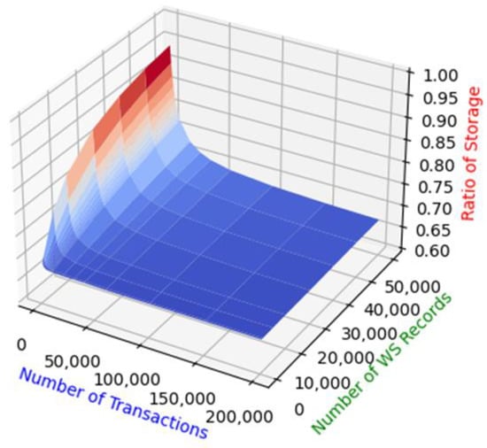 In the network used for the experiments, set the data size Sw for one record of the world state, the data size St for one transaction and the block size Sb, ignoring block header. When the number of transactions achieved the block size threshold, a new block is generated and sent to the network, and the peer nodes in the network save the block according to the rules of proposed scheme. Set two variables Nw and Nt, where Nw denotes the number of records in the world state and Nt is the number of transactions. Increasing the value of Nw and Nt sequentially and continuously, until Nt is an integer multiple of Sb, called a round, and records the value of Equation (1).