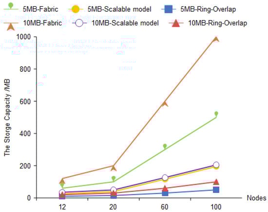 The experimental results are shown in Figure 8, where the x-axis is the number of nodes and the y-axis is the total amount of storage. The graph shows that when the number of nodes increases, the storage space occupied by the ring-overlap mechanism is significantly reduced compared to the Fabric blockchain system and the scalable storage model.