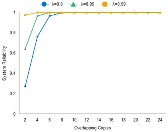 The reliability analysis in Section 5.2.1 shows that the mechanism can still guarantee block data integrity when the number of node failures in a single cluster does not exceed s − 1. If the reliability of a single node is labeled as λ, when λ is the same, the larger the value of s, the higher the reliability of a single cluster; when s is the same, the failure rate of a single cluster decreases as λ increases. The system reliability q corresponding to different values of s can be calculated by Equation (2).