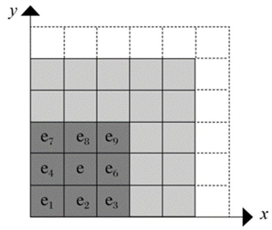 The center of each grid is an elevation point, and the slope of the center point e is calculated [19]. See Formula (3):