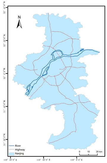 Considering the existence of road networks, rivers and other factors that may affect the safe operation of aircraft, this paper selects the main traffic lines in Nanjing and the banks of the Yangtze River to establish a buffer zone with a width of 50 m to prevent helicopter take-off and landing points from falling into the buffer zone. In this part, the buffer is set linearly. The road network and river information are downloaded from the Resource and Environmental Science and Data Center of the Chinese Academy of Sciences and can be directly applied to the software, as shown in Figure 3.