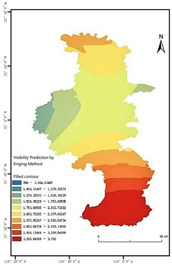 Since the visibility information in this paper is obtained from weather stations, it is scattered and has basic errors. It is appropriate to use the ordinary Kriging interpolation method. For a given dataset , the corresponding objective function is . The Kriging method assumes that all data are subject to an n-dimensional normal distribution, so the objective function is a random process, and each variable in it is random.