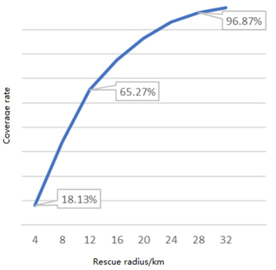 In order to accurately obtain the relationship between the medical coverage and the rescue radius, the geographic coordinates of the preliminary screening results were extracted by using GIS technology, and the ground surface was divided into small squares of 1 km2. If the distance between the coordinates and the center of the square is lower than the rescue radius, it is considered that the area is within rescue range, and this square is within the coverage. We calculated the percentage of the squares within the coverage, and coverage rate was acquired. On this basis, this paper calculates the relationship between the rescue radius of the take-off and landing point and the coverage rate and obtains the approximate variation law of the two, as shown in Figure 5.