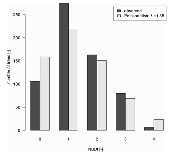 The bark damage observed on the trees did not exceed four instances. The Poisson distribution with λ = 1.38 was used for the description of the observed NBDI (Figure 1). The Kolmogorov–Smirnov test was applied to verify the coherence of the theoretical and empirical distributions. The calculated p-value was bigger than the critical pcr, confirming the consistency of both distributions.