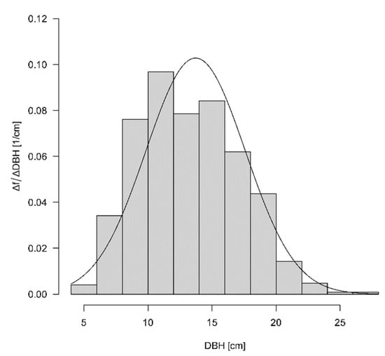 A line representing the density of the normal distribution seems to adequately describe the histogram of the DBH observations. Shapiro–Francia, Anderson–Darling, and Cramer–von Mises tests were used for the evaluation of DBH distribution normality. The calculated p-values were orders of magnitude lower than the critical pcr. Rejection of the null hypothesis regarding the DBH distribution normality was clear.