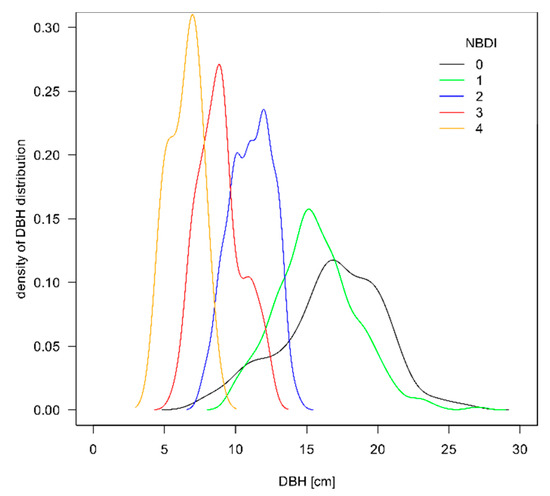 Similar means and medians for the NBDI: {0..4}, indicate no outlying observations. This assertion is supported by similar SD and MAD values. The general tendency shows a decrease in the parameter values corresponding with an increase in NBDI. Figure 3 depicts density plots illustrating distributions of DBH for respective NBDI. The distributions are unimodal, with decreasing positions of maximum and variability along with increasing NBDI.