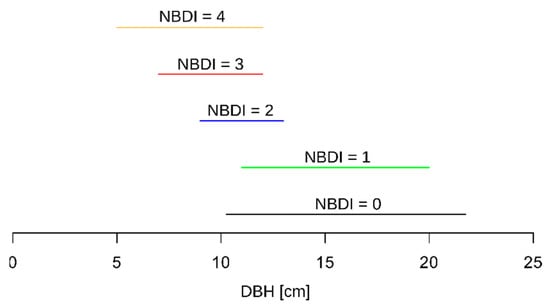 Figure 4 shows positions of the ranges that limit 90% of the most frequent DBH values. Five percent tails of the lowest and highest values were cut to illustrate the most common values of DBH. A shift of the ranges toward lower DBH values and a decrease in their length along with an increase in NBDI were observed. A clear exception is the range for NBDI = 4. Low numbers of observations used in the calculations may be the cause of the range that is wider than expected.