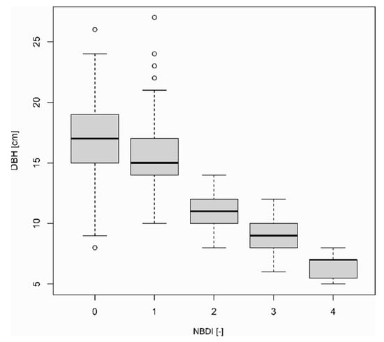 The influence of NBDI on DBH changes was studied. Figure 5 contains boxplots representing DBH distribution for different NBDI. The positions of boxes in the plot suggest a monotonical decrease in DBH along with increasing NBDI.
