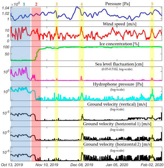 The semi-transparent colored numbered rectangles indicate the specific time periods, characterized by a certain pattern. The blue rectangle 1 corresponds to the period of time when the sea was free of ice—this can be seen from the ice concentration curve. During this period of time, the wave recorder, hydrophone and seismometers data curves correlated well with the wind speed curves. The peak positions of the curves are in good agreement with each other. The red rectangle 2 corresponds to the period of time of rapid ice formation, and also a sharp decrease in the amplitudes of sea level fluctuations and the level of seismic noise on all seismic sensors. The yellow rectangles 3–5 indicate the time intervals of a remarkable and rather long increase in the amplitudes of sea level fluctuations and seismic noise level within the period when the sea was covered with ice. These time intervals coincide with the moments of short but sharp wind speed increase above 14 m/s and also with a short but sharp drop in atmospheric pressure.