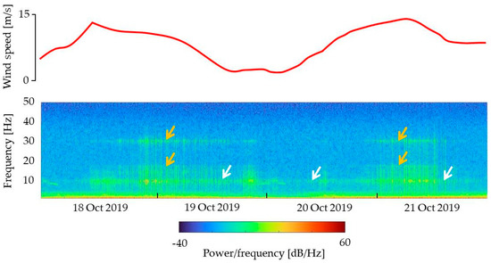 Figure 4 shows on a larger scale the time history of wind speed at the Typ2 site and its correlation with the increase of the seismic noise level shown on the spectrogram obtained for the horizontal seismometer at the Typ2 site. It can be seen that the signal amplification at 10 Hz is present all the time at any wind strength (indicated by the white arrows), while with an increase in wind speed this signal becomes more pronounced. In this case, additional maxima appear at 18 and 30 Hz (indicated by the orange arrows).