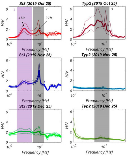 HVSR plots for 6–8 h-long OBS records obtained at the St3 and Typ2 sites on 25 October, 25 November and 25 December 2019. Thick lines—average curves, thin lines—maximum and minimum curves. Semi-transparent colored numbered rectangles indicate the specific frequency ranges, described in the text.