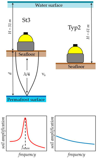 Figure 9 shows the schematic view of the OBSs deployed in the Laptev Sea with indication of sea depths and representation of the resonance effect and its relation to soil amplification curves. Figure 10 shows, in turn, the assumed initial velocity profiles for the St3 and Typ2 sites.