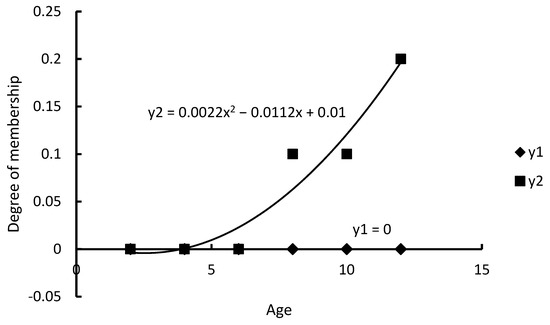 Taking the index of age as an example, this continuous variable is divided into six intervals: under 14 years old, 14–18 years old, 19–30 years old, 31–50 years old, 51–60 years old and over 60 years old. Then, the data collected in these six intervals are fitted, respectively, to obtain the single factor evaluation of different age intervals. In the interval of under 14 years old, the single factor evaluation vector is r1 = [r11, r12, r13], where r11, r12 and r13 are the degrees of belonging to high-risk, medium-risk and low-risk, respectively, and r11 + r12 + r13 = 1. Let y1, y2, and y3 be the fitting functions corresponding to r11, r12, and r13. According to the existing statistical data, the fitting results of y1 and y2 are shown in Figure 1, where y1 = 0, y2 = 0.0022x2 − 0.0112x + 0.01. Then, y3 = −0.0022x2 + 0.0112x + 0.99 can be calculated by Equation (7).
