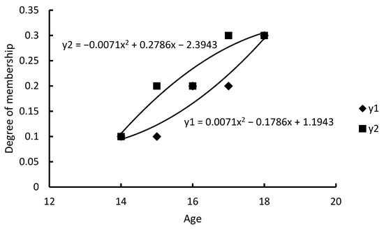 Similarly, in the interval of 14–18 years old, the fitting results of y1 and y2 are shown in Figure 2, where y1 = 0.0071x2 − 0.1786x + 1.1943, y2 = − 0.0071x2 + 0.2786x − 2.3943. Then y3 = −0.1x + 2.2 is calculated by Equation (7).