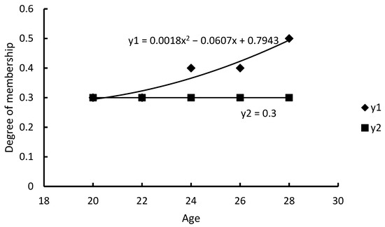 In the interval of 19–30 years old, the fitting results of y1 and y2 are shown in Figure 3, where y1 = 0.0018x2 − 0.0607x + 0.7943, y2 = 0.3. Then y3 = −0.0018x2 + 0.0607x − 0.0943 is calculated by Equation (7).