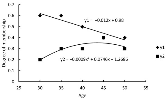 In the interval of 31–50 years old, the fitting results of y1 and y2 are shown in Figure 4, where y1 = −0.012x + 0.98, y2 = −0.0009x2 + 0.0746x − 1.2686. Then y3 = 0.0009x2 − 0.0626x + 1.2886 is calculated by Equation (7).