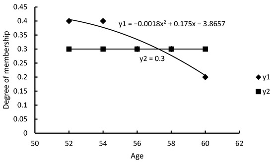 In the interval of 51–60 years old, the fitting results of y1 and y2 are shown in Figure 5, where y1 = −0.0018x2 + 0.175x − 3.8657, y2 = 0.3. Then y3 = 0.0018x2 − 0.175x + 4.5657 is calculated by Equation (7).