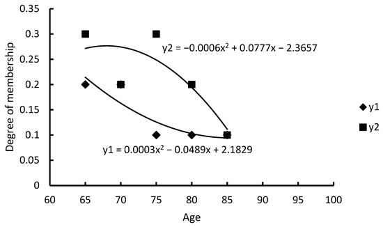 In the interval of over 60 years old, the fitting results of y1 and y2 are shown in Figure 6, where y1 = 0.0003x2 − 0.0489x + 2.1829, y2 = −0.0006x2 + 0.0777x − 2.3657. Then y3 = 0.0003x2 − 0.0288x + 1.182 is calculated by Equation (7).