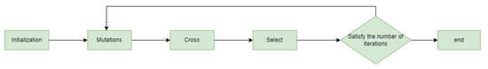 The differential evolution algorithm, as an efficient global optimization algorithm based on the natural evolution of species, is simple and efficient in practical applications [21]. It evolves a population of Np D-dimensional parameter vectors, mainly through mutation, crossover, and environmental selection operations. That is, first randomly generate initial test solutions; then, generate new test solutions through mutation and crossover operations. Next, determine which test solutions enter the next generation population to become candidate solutions through selection operations, and then repeat the iterative operations of mutation, crossover, and selection until all the experimental solutions are selected. The solution stops when the accuracy of the current solution meets the requirements or when a certain number of iterations is reached.