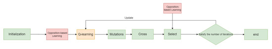 Therefore, in terms of using evolutionary algorithms to select the best strategy, there is not yet a good and general evolutionary algorithm. With the deepening of the research on reinforcement learning [11,12,13] and opposition-based learning [14,15,16] in recent years, the method of using opposition-based learning combined with evolutionary algorithm has appeared [17,18,19], but it has not been widely applied in practice. There are also examples of combining reinforcement learning and evolutionary algorithms to solve problems [20]. Huzhenzhen et al. used the differential evolution algorithm improved by reinforcement learning to extract the parameters of the photovoltaic model [21]. Huynh used reinforcement learning to improve the differential evolution algorithm [22]. Five benchmark examples for minimizing the weight of truss structures are verified, and good results have been achieved. We draw on the ideas in [21,22] to apply reinforcement learning to the differential evolution algorithm, and we find that the methods proposed in [21,22] can complement each other’s shortcomings. So, we make improvements on this basis and form the prototype of the algorithm in this paper. However, the main function of reinforcement learning is to improve its convergence speed, and it is not a good solution to the problem of premature convergence, so we need an algorithm that can improve both the convergence speed and the convergence accuracy.