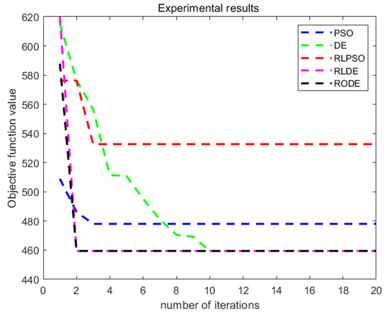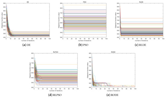 Last but not least, in the second experiment, comparing RLDE and RODE in Figure 10, that is, when the population is 200, the performance of RODE and RLDE is almost the same, indicating that RODE has played a role in reinforcement learning. Comparing RLDE and RODE in Figure 11, that is, when the population is 10, the effect of RODE is much higher than that of RODE, because RODE has the effect of opposition-based learning at this time. So, we have reason to believe that RODE greatly improves the performance of the DE algorithm, and our method also provides a good idea for improving other evolutionary algorithms.